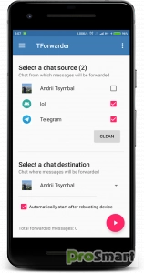 TForwarder может автоматически пересылать сообщения для вас по ключевому слову или без каких-либо фильтров из выбранных чатов телеграмм в нужный канал или группу телеграмм или напрямую вашему другу. Вы можете использовать приложение как рассылку сообщений из любых чатов телеграмм (приватные каналы, приватные группы, прямые чаты) в один чат.