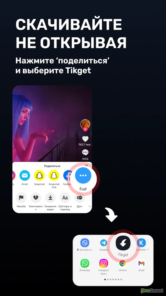 2) Нажмите кнопку "Поделиться", выберите приложение Tikget. Далее, чтобы скачать видео из тик тока, от вас ничего не требуется, загрузка видео начнётся автоматически.
