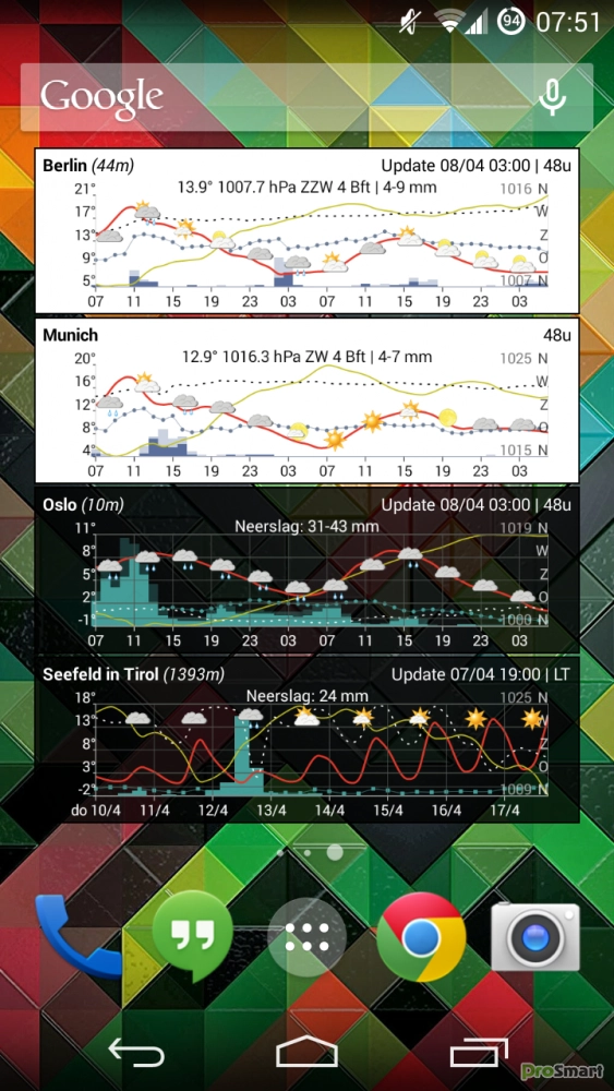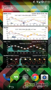 Основное внимание в приложении уделяется показу метеограммы на небольшом виджете на главном экране (например, на виджете 4X1). Несмотря на то, что виджет не занимает много места на главном экране, он по-прежнему четко отображает прогноз. Просто добавьте виджет на главный экран, укажите свое местоположение (или позвольте виджету автоматически определить ваше местоположение), и прогноз погоды появится на главном экране. Метеограмма показывает температуру и ожидаемые осадки за весь период прогноза. Помимо этих погодных элементов, на метеограмме также можно визуализировать скорость ветра, направление ветра и атмосферное давление. Пользователь имеет полную свободу настройки того, как должна выглядеть метеограмма.