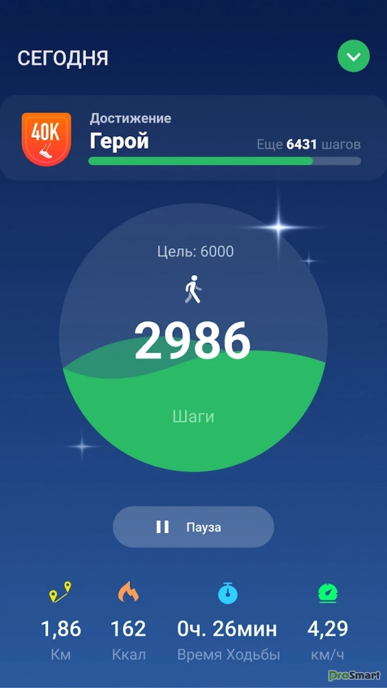 Для экономии заряда подсчет шагов можно в любой момент ставить на паузу и возобновлять. На паузе приложение не будет обновлять статистику в фоновом режиме. А если захотите, можно сбросить шаги за день и начать считать с нуля.