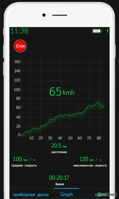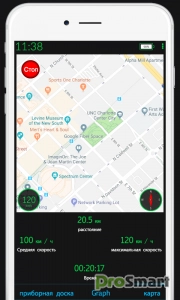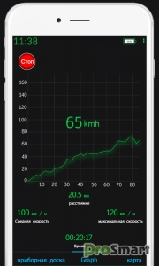 • Просмотр графика зависимости скорости от времени за всю поездку.