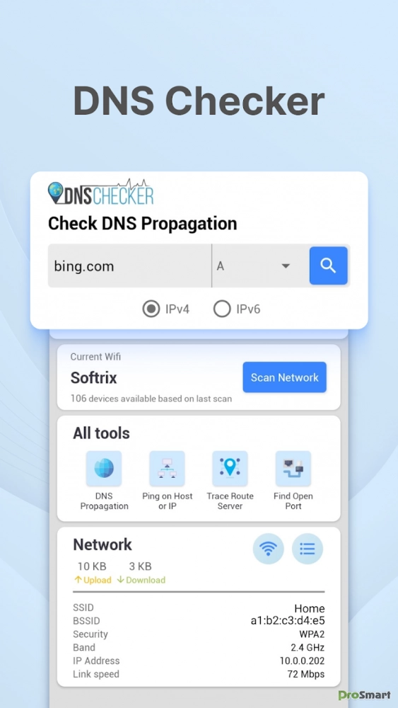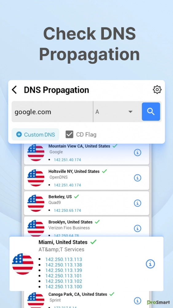 Это быстрое и надежное приложение DNS поможет вам быстро проверить и проанализировать DNS с помощью нескольких инструментов, таких как MX Lookup, CNAME Lookup, Reverse IP Lookup, NS Lookup, DNSKEY Lookup, DS Lookup и других. Вы также можете проверить изменения DNS с нескольких серверов по всему миру. Это приложение DNS идеально подходит для веб-мастеров, разработчиков и сетевых специалистов. Оно гарантирует, что записи DNS вашего домена актуальны и правильно настроены.