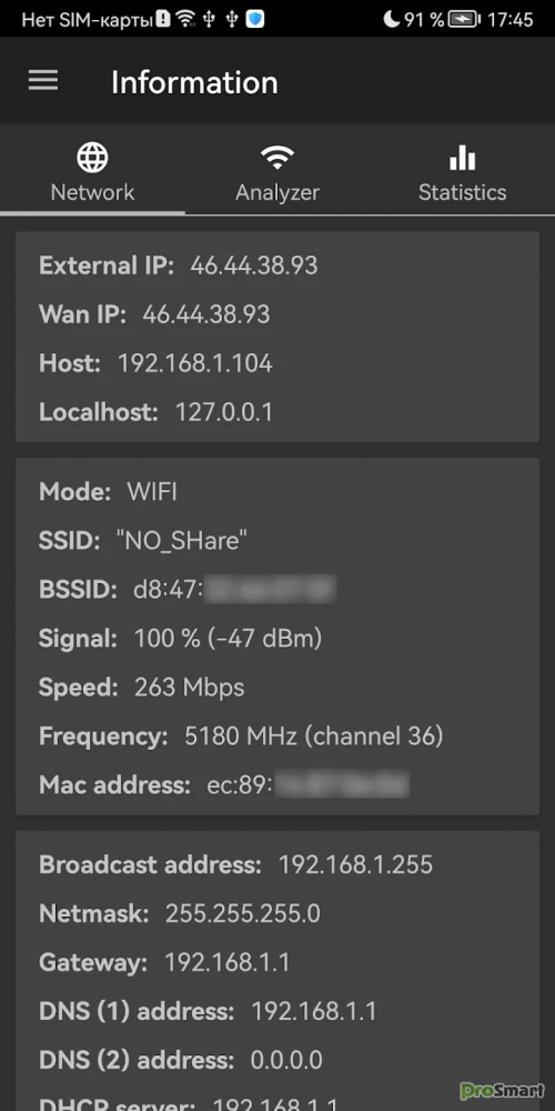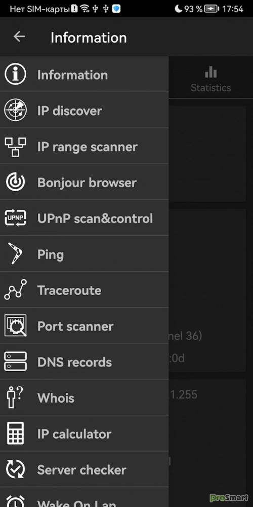 • Network information поможет узнать внешний IP и отобразит подробную информацию о соединении. Также доступны инструменты wifi analyzer и traffic statistics