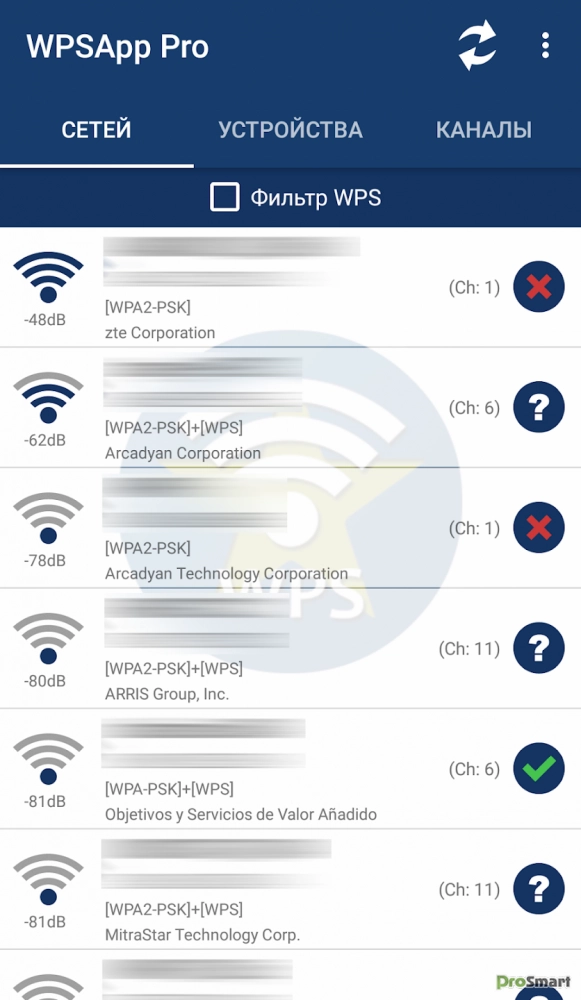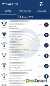 Использование очень просто, при сканировании сетей вокруг нас мы увидим некоторых с красным крестом, это «безопасные» сети в кавычках, у них отключен протокол WPS и пароль по умолчанию неизвестен.