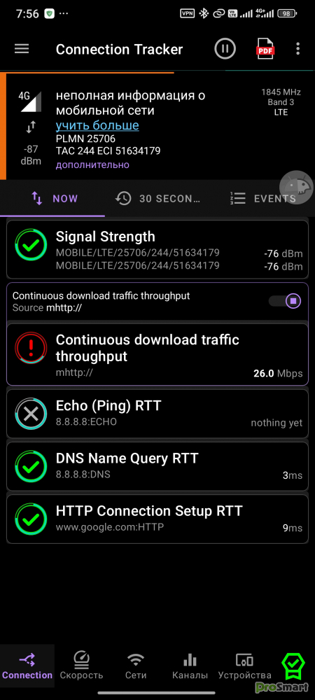 * Connection Tracker — отслеживание событий роуминга Wi-Fi, мобильных и межсистемных переключений с непрерывным тестированием скорости; включение анализа влияния событий роуминга/хендовера на скорость и RTT