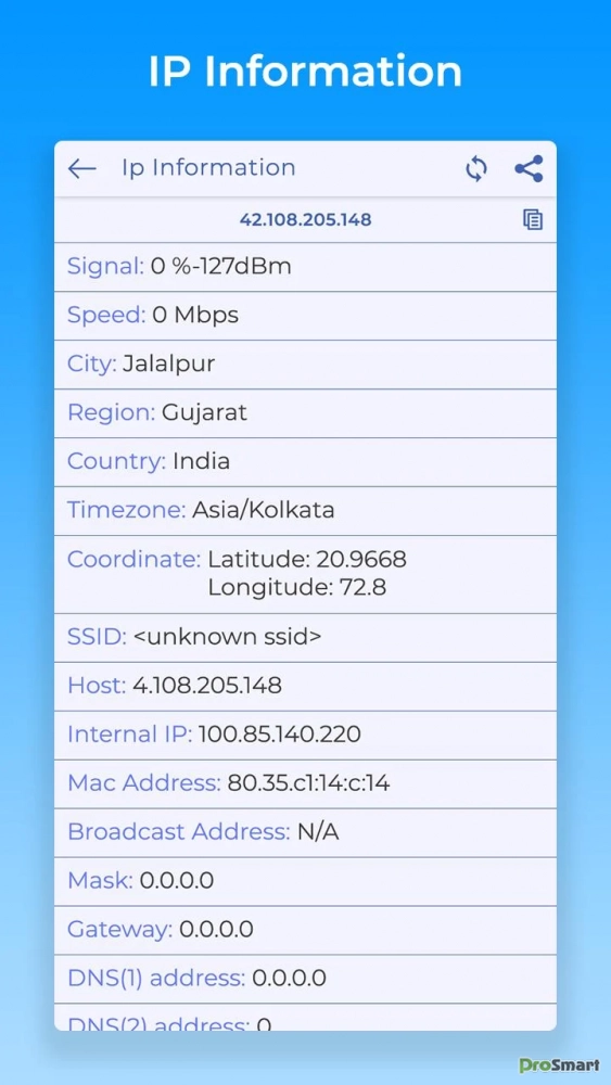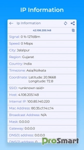 Подробная информация об IP-адресе, включая: внутренний/внешний IP, DNS, шлюз, местоположение сервера (широта-долгота) и сведения о SSID.