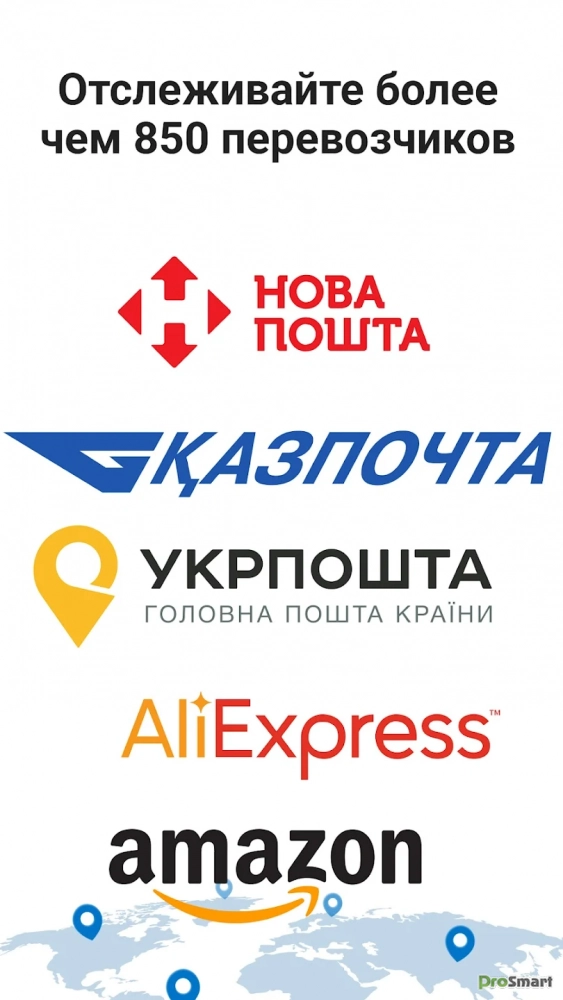 УкрПочта (UkrPoshta), Новая Почта, (Nova Poshta), Meest Express, Казпочта (Kazpost), СДЭК (CDEK), Почта России (Russian Post), СПСР (SPSR Express), DPD, DHL, UPS, FedEx, GLA, TNT, EMS, Hermes, Colissimo, USPS (Почта США), InPost, China Post, БелПочта, Автолюкс, Гюнсел, Деливери (Delivery), Royal Mail, Correos Spain, Canada Post, Japan Post, Deutsche Post, Poste Italiane, La Poste и др. И вам нужен только трек-код!