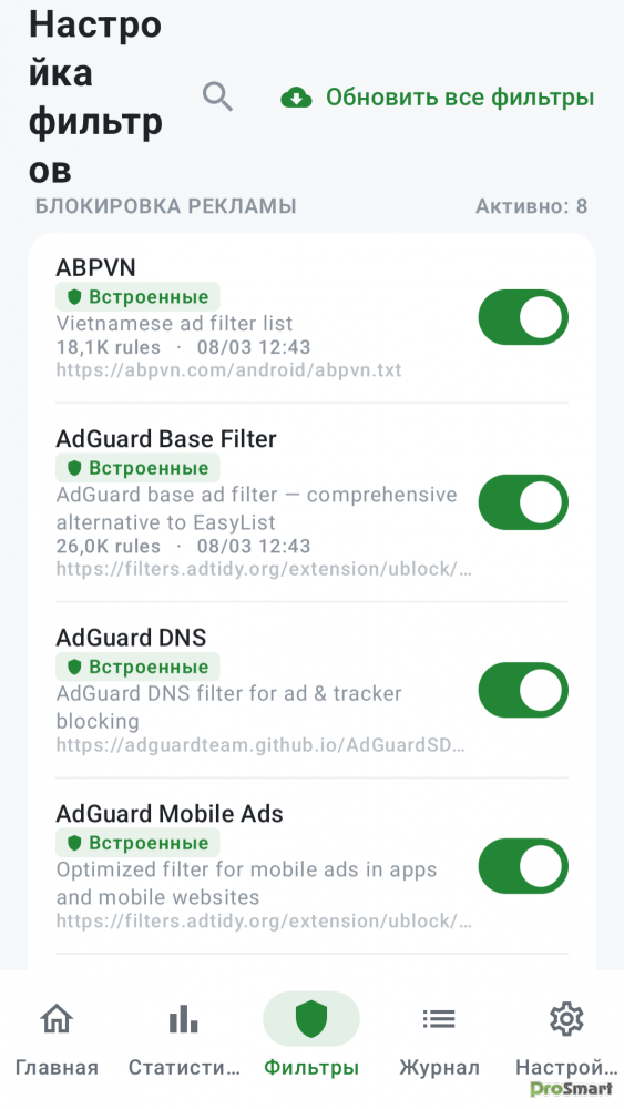 - Автоматическое обновление списков фильтров по расписанию (6 часов / 12 часов / 24 часа / 48 часов)