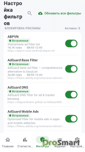 - Несколько встроенных списков фильтров (StevenBlack, AdGuard DNS, EasyList и другие)