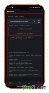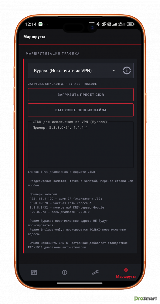 Маршрутизация, два режима: В или ВНЕ туннеля. ТОЛЬКО IPV4 CIDR нотации. Адреса пишутся в JSON с настройками. (Крайне экспериментальная фича)
