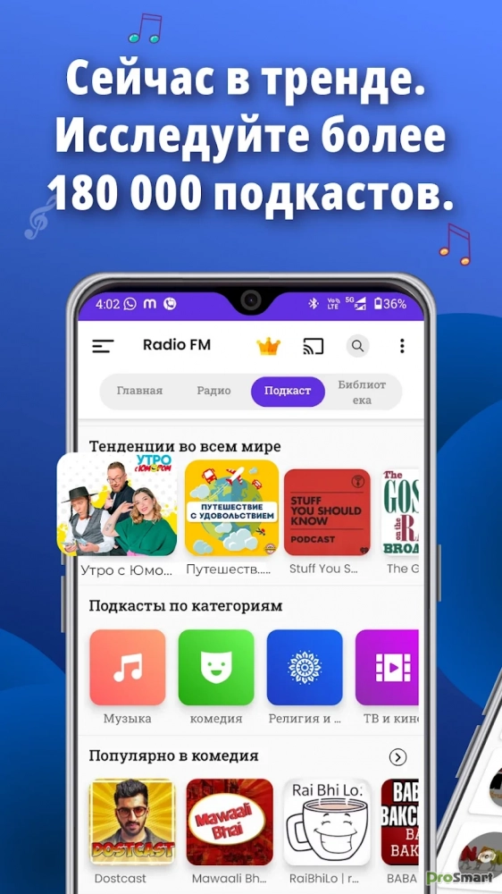 ✔ Огромная библиотека контента — более 20 млн выпусков подкастов и более 50 000 станций