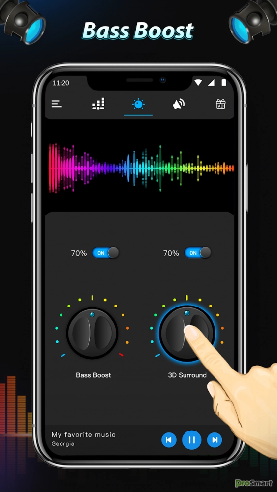 Эквалайзер и усилитель низких частот состоит из ползунка громкости, усилителя нижних частот, виртуального 3D эффекта, 5-полосного эквалайзера и т.д. Звуковые эффекты лучше слышны в наушниках.