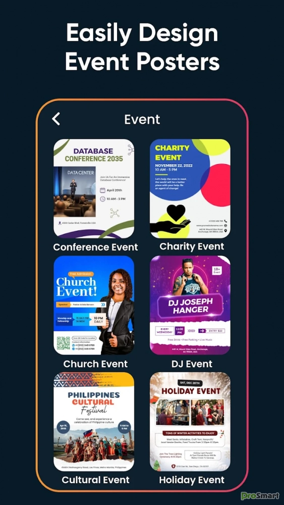 Легко создавайте высококачественный дизайн плаката на холсте, который полностью адаптируется к фотографиям и тексту для всех ваших нужд. Наше приложение предоставляет множество шаблонов плакатов и графического дизайна для различных мероприятий, включая дни рождения, музыкальные мероприятия, такие фестивали, как Рождество, Новый год, Дивали и многое другое.