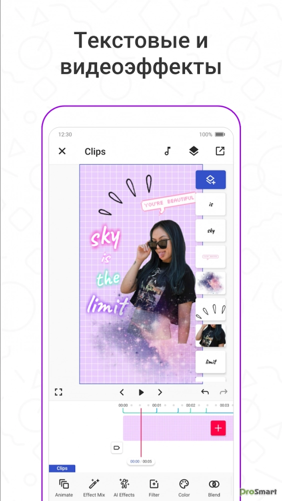 Создавай топовые видео и улучшай их с помощью уникальных переходов, анимаций, фильтров. Ты можешь добавлять текст и видеоэффекты , выбрать стикеры, фоны и оверлеи из тысяч элементов в нашей библиотеке. Удивляй друзей своим креативом!