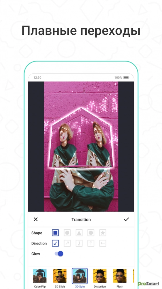 ПЕРЕХОДЫ. Добавляй их одним нажатием! В приложении ты найдешь лучшие видеопереходы, которые точно впечатлят подписчиков. Просто добавь фото и видео, и всего с помощью пары нажатий ты создашь классный видеоклип с переходами уровня профи.