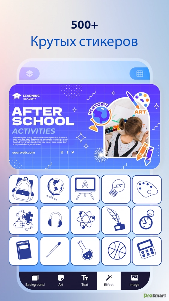 Измените фоны и наклейки из библиотеки или загрузите свои собственные изображения.