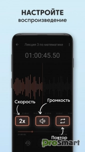 Мини-плеер, доступный в списке записей, позволяет сразу же прослушать запись, а полноэкранный проигрыватель предлагает расширенный набор функций воспроизведения.