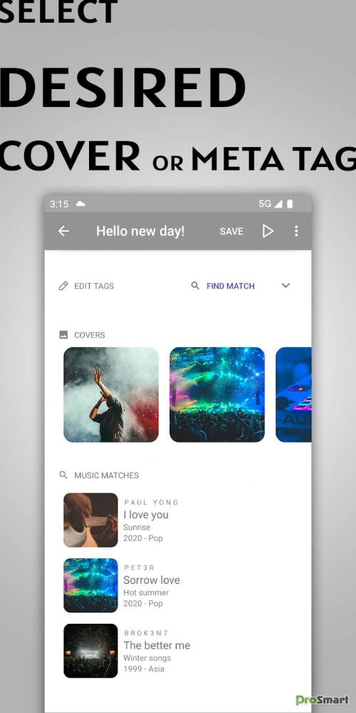 Приложение предоставляет функцию Smart tagger, которая автоматически найдет лучшее соответствие для вашей музыки мгновенно. Бесплатная и полная функция, не нужно платить за пакетную расстановку тегов для вашего аудио. Встраивайте текст песни в аудиофайл для воспроизведения в автономном режиме. Поддержка встроенной вкладки поиска текста песни. Загружайте изображение обложки высокого разрешения для встраивания в аудиофайл.