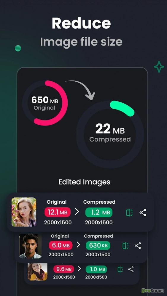 Теперь пришло время попробовать одно из лучших приложений для уменьшения размера изображения! Мы поддерживаем сжатие изображений с помощью передовых технологий, чтобы вы могли наслаждаться плавным сжатием и изменением размера фотографий. ☑️Загрузите наше приложение для сжатия изображений JPEG и изменения размера, чтобы получить удовольствие от сжатия фотографий!
