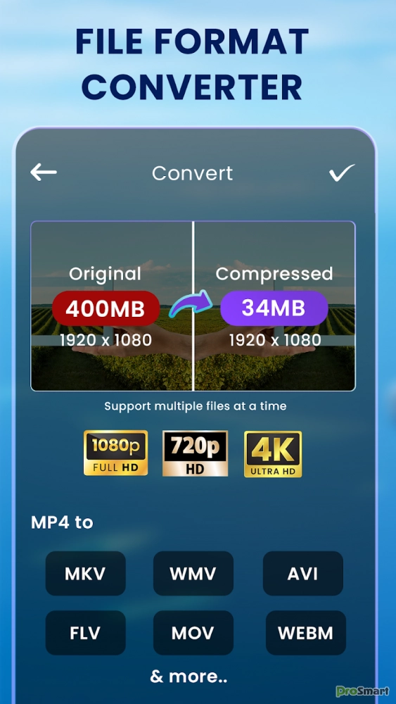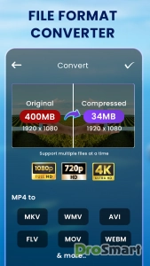 🔄 Помимо использования его в качестве компрессора видео mp4, вы также можете конвертировать видео в другие форматы, изображения и картинки. Доступно множество видеоформатов, таких как MP4, AVI, MOV, FLV, MKV, WMV, WEBM, 3GP, F4V, TS и т. д. Просто выберите видео из своей галереи и выберите конвертер форматов файлов, видео в изображение или видео в подарок. инструменты конвертера с главной страницы.