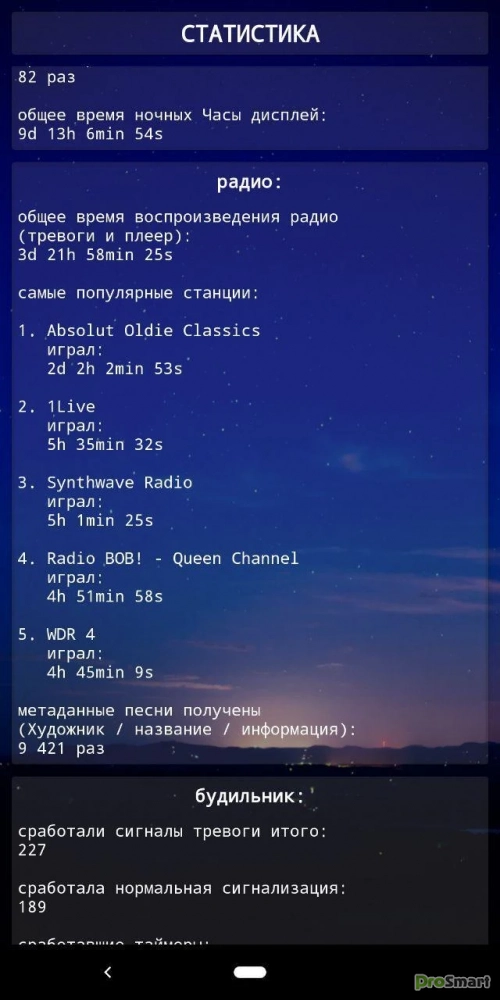 •статистика :) - изучите подробную статистику о своем поведении в отношении вставания, прослушивания радио и других действий в приложении