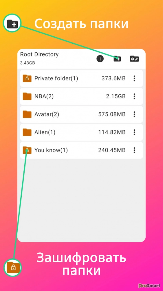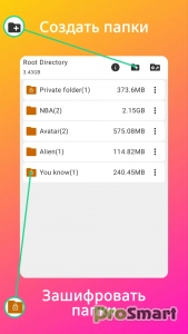 - Защищенные папки: Создавайте любое количество папок с защитой PIN-кодом или блокировкой экрана.