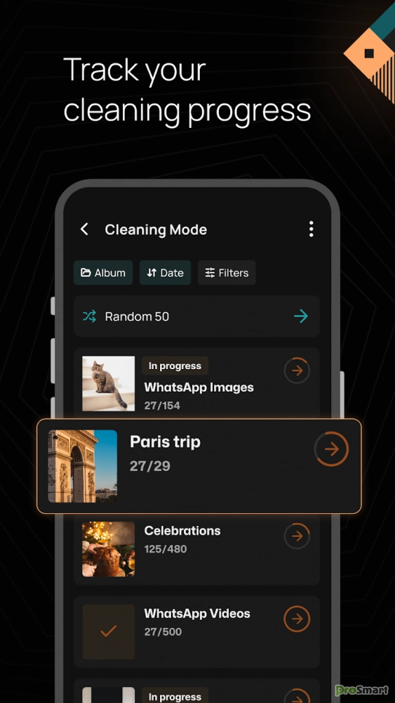 Sponge делает уборку галереи телефона увлекательной и простой благодаря игровому процессу. Просто проведите пальцем, чтобы удалить ненужные фотографии и видео, и наслаждайтесь тем, как ваша галерея мгновенно очищается. Приложение запоминает, где вы остановились, поэтому вы можете продолжить уборку с того места, где остановились.