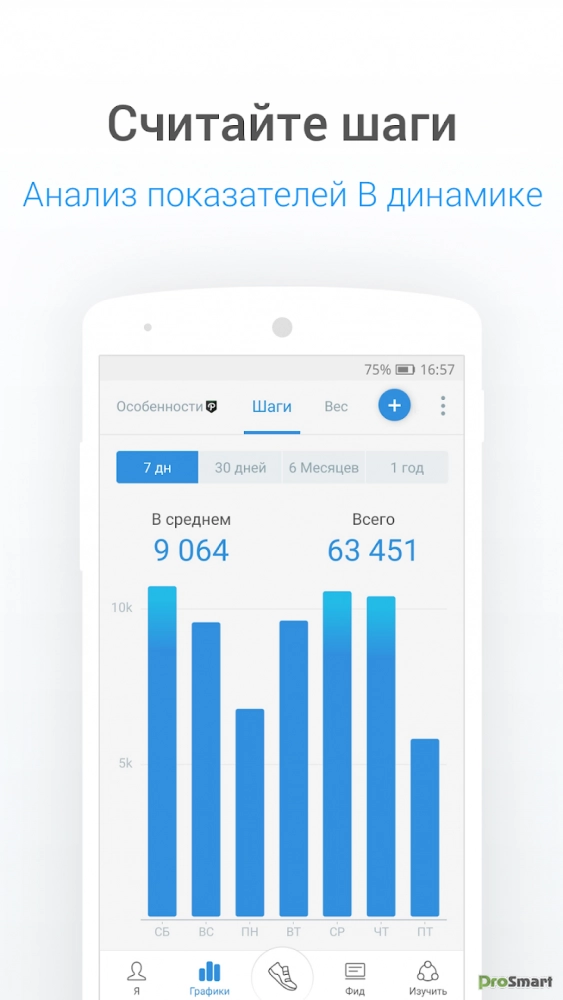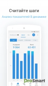 -Привлекательные графики с данными о количестве пройденных шагов, сожженных калориях и весе