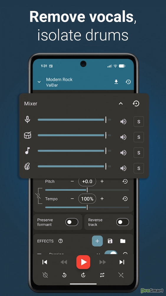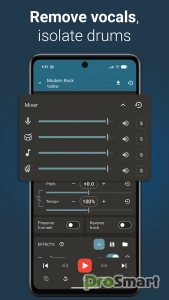 - Переключатель скорости музыки: измените скорость воспроизведения звука и темп песни. Играйте мгновенно, регулируя скорость звука и высоту тона в реальном времени.