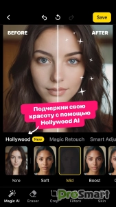 • Гладкая кожа: используйте редактор, чтобы убрать морщины и улучшить качество фото. Специальная функция “Отбеливание зубов” поможет добавить блеска вашей улыбке.