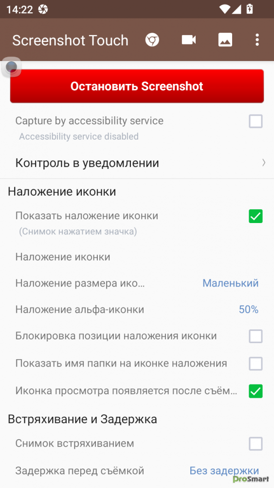 • Захват касанием (область уведомлений, наложенный значок, встряхивание устройства)