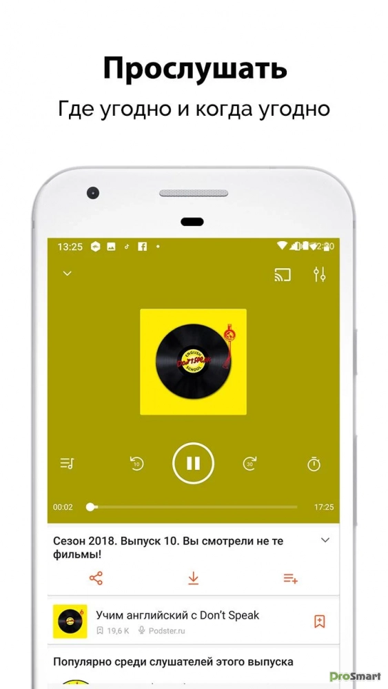 - Слушайте свои любимые подкасты или ищите новые на 70 разных языках.