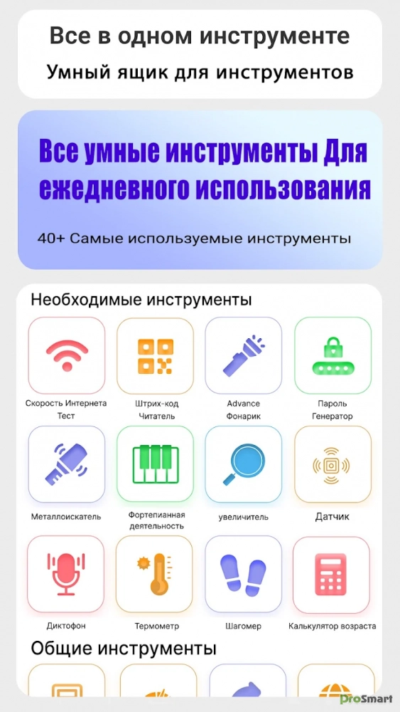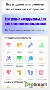 Кроме того, в приложении Smart Toolbox есть проверка скорости Интернета, калькулятор возраста, погода, спидометр, простые заметки, пузырьковый уровень, стоимость топлива, генератор QR-кодов, игра на пианино, прямая линейка, калькулятор скидок, конвертер площади, секундомер, текстовая речь, счетчик шагов (шагомер), детектор цвета, диктофон, термометр, ИМТ, информация об устройстве и инструменты датчиков. С приложением All in One Smart Toolbox вы можете работать умнее, исследовать дальше и достигать большего. Используйте его и оцените удобство и эффективность, которые оно приносит вашему смартфону.