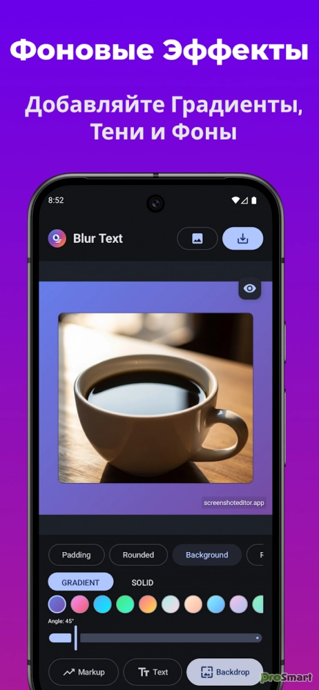 Скрывайте конфиденциальную информацию на скриншотах. Размытие, редактирование и выделение текста одним касанием! Инструменты разметки, добавление текста на фотографию, аннотации, фон (фоновые эффекты, стили, градиенты)