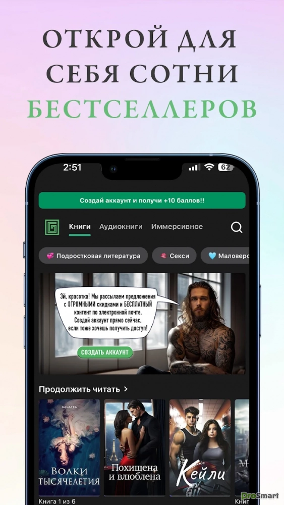 Галатея предлагает увлекательные истории: от любовных романов от плохих парнях-миллиардерах до книг о байкерах, драконах, оборотнях и вампирах: