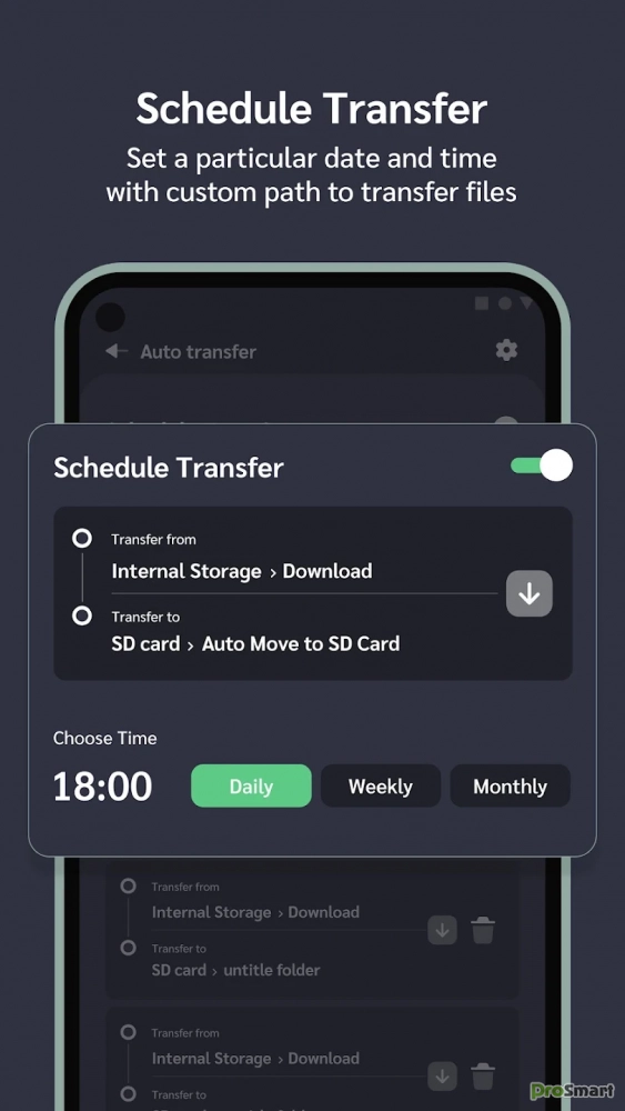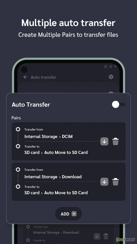 Благодаря этой функции автоматическая передача помогает автоматически переносить файлы из внутреннего хранилища во внешнее хранилище, избегая исчерпания внутренней памяти. Эта функция поддерживает все файлы изображений, видео, аудио, документов, apk и других типов файлов.