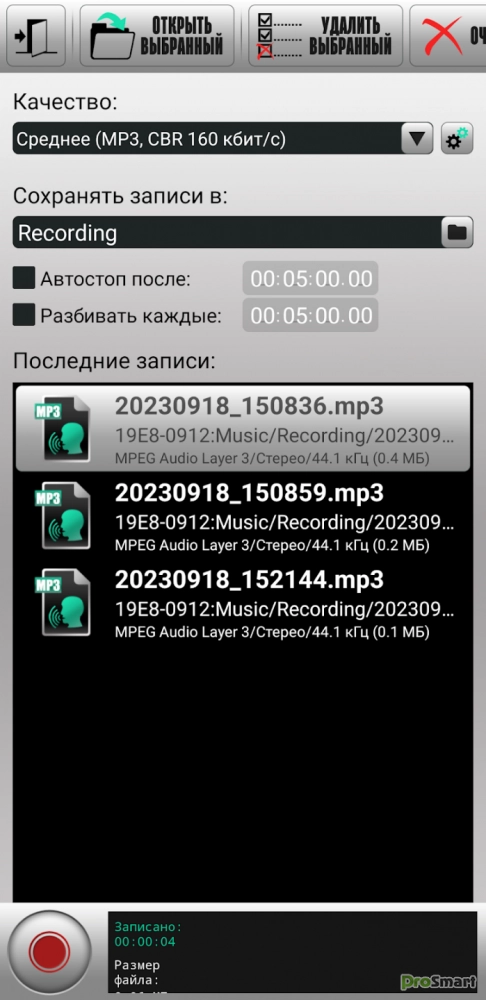 - запись звука с микрофона с возможностью автоматического разбиения на части и сохранения в различные форматы (MP3, Ogg Vorbis, Opus, FLAC, PCM-Wave);
