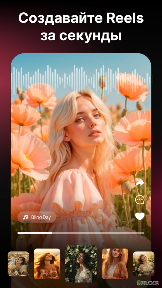 Превращайте обычные или AI-фото в анимированные истории или вертикальные видео 9:16, добавляйте музыку и синхронизируйте всё одним касанием. Выбирайте треки из нашей библиотеки или загружайте свои. Одной короткой подписи или аккуратного стикера будет достаточно.