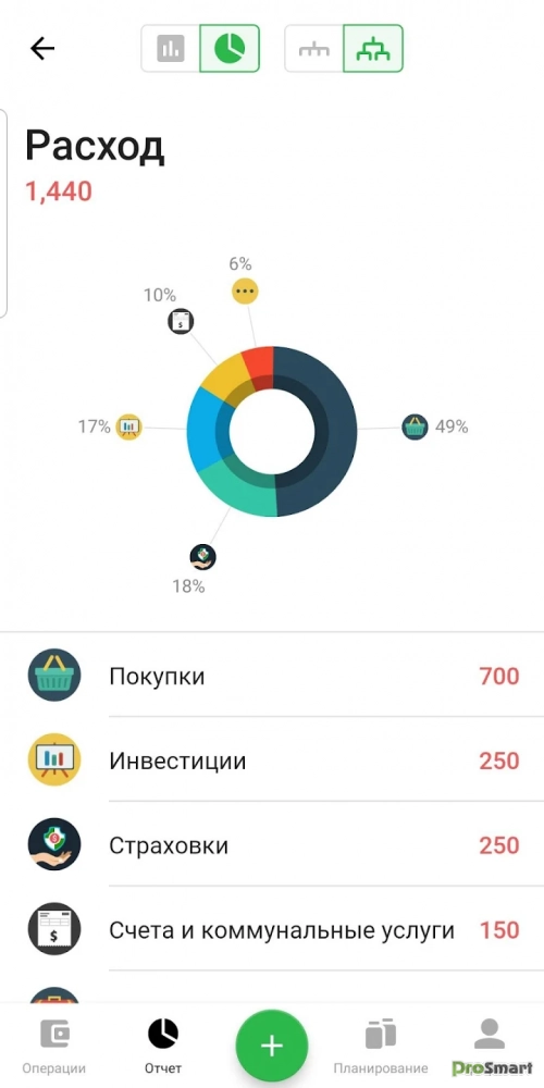 ✔ Получайте подробные финансовые отчеты в различных форматах, таких как круговые диаграммы, столбчатые диаграммы и категоризированные разбивки.