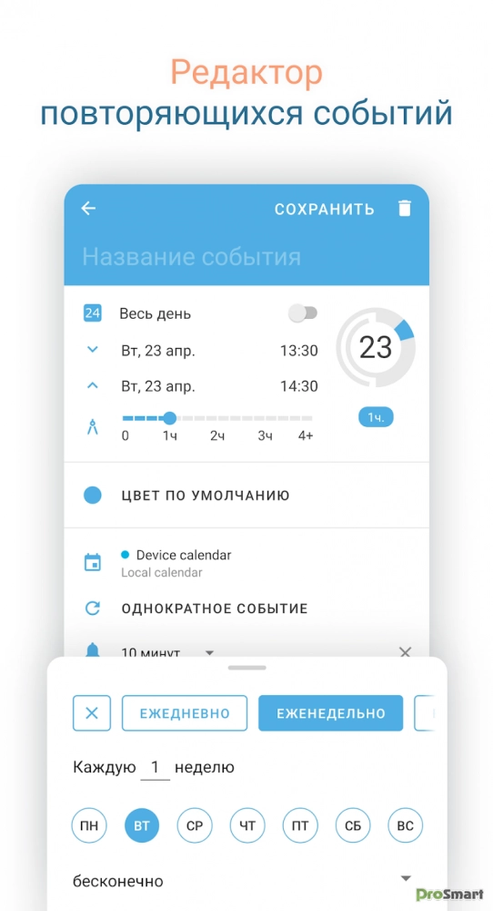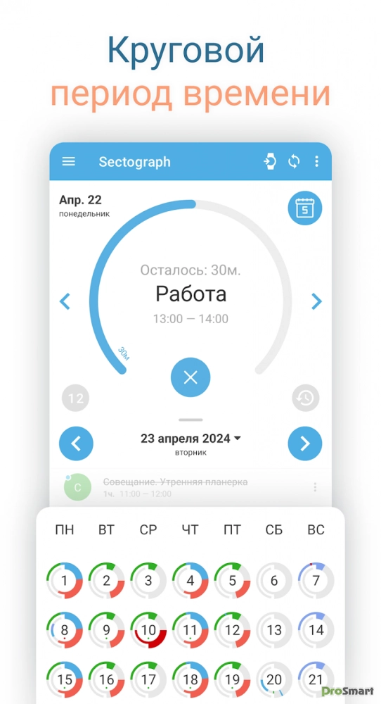 Календарь и аналоговые часы в сочетании, дают удивительно наглядное представление вашей занятости, позволяют эффективно планировать и рассчитывать дневное время.