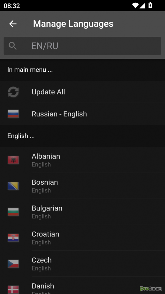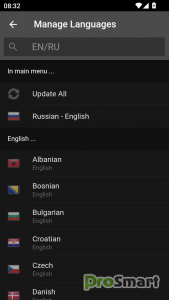Албанский, боснийский, болгарский, датский, эсперанто, финский, французский, греческий, исландский, итальянский, хорватский, латинский, голландский, норвежский, польский, португальский, румынский, русский, шведский, сербский, словацкий, испанский, чешский, турецкий, венгерский