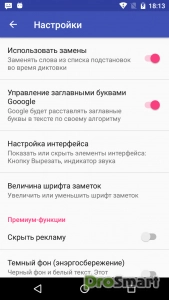 Имеет счетчик слов и символов, удобно для двуязычного голосового ввода. Экспортирует заметки в папку «Документы» или «Загрузить» или отправляет их в любую текстовую программу. Импортирует текстовые документы из файловых менеджеров и Google диска.