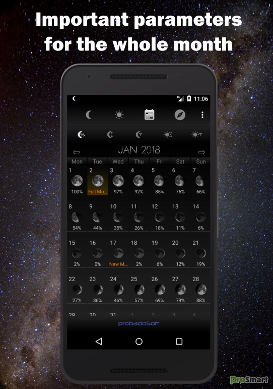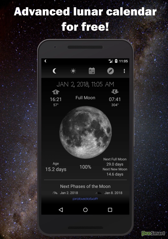 - Вид Луны с более чем 15 полезными параметрами, включая текущую фазу Луны, освещенность, восход и заход Луны, даты последующих фаз