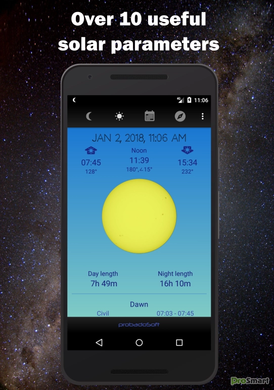 - Представление Солнца с более чем 10 полезными параметрами, включая восход и закат, рассвет, сумерки, продолжительность дня и ночи