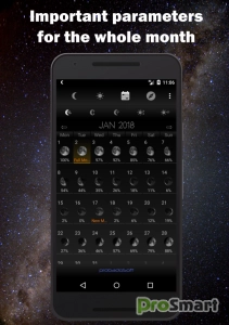 - календарь с видом на выбранный месяц и важные параметры Луны или Солнца.