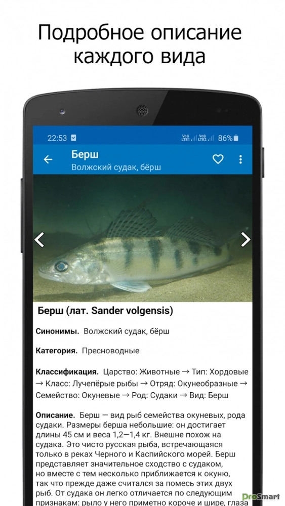 Описание каждого вида рыб содержит 3 цветные фотографии в высоком разрешении. Для просмотра фотографии на весь экран кратковременно коснитесь её. В полноэкранном режиме доступно масштабирование и пролистывание изображений влево или вправо, а также просмотр их в альбомной ориентации.