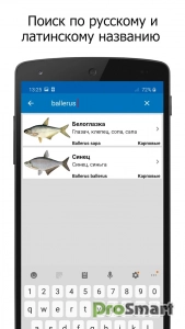 Приложение поддерживает поиск по названию рыбы на русском и латинском языках, а также поиск по названию семейства, к которому принадлежит определенный вид рыб.