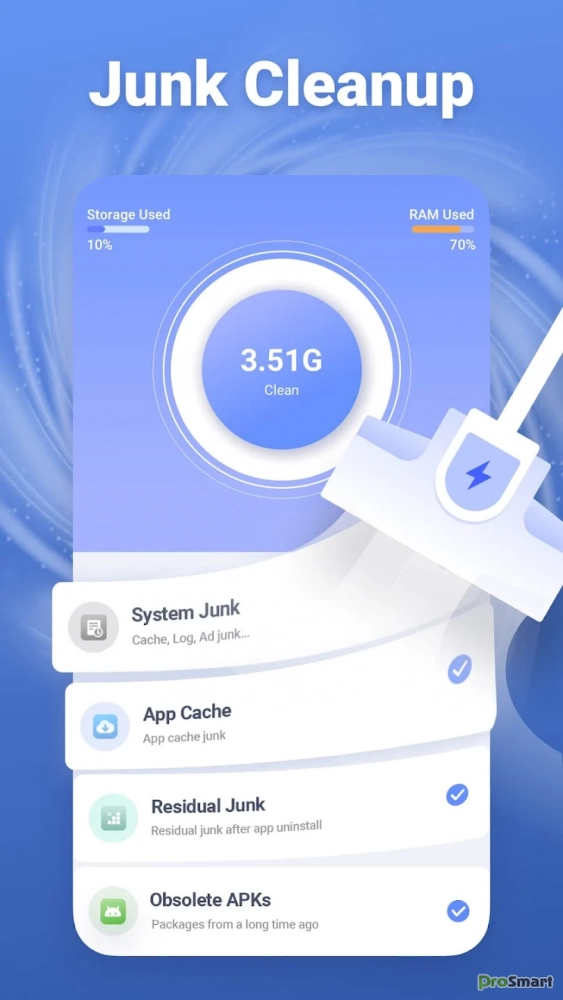1. Основная функция «Очистка». Это разрешение необходимо для поиска приложений, связанных с ненужными APK-файлами, для их четкого представления пользователю.