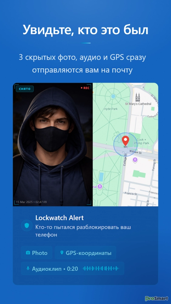 • Незаметно делает снимок на фронтальную камеру и отправляет его вам по электронной почте вместе с GPS-координатами местоположения злоумышленника, и он об этом не узнает.