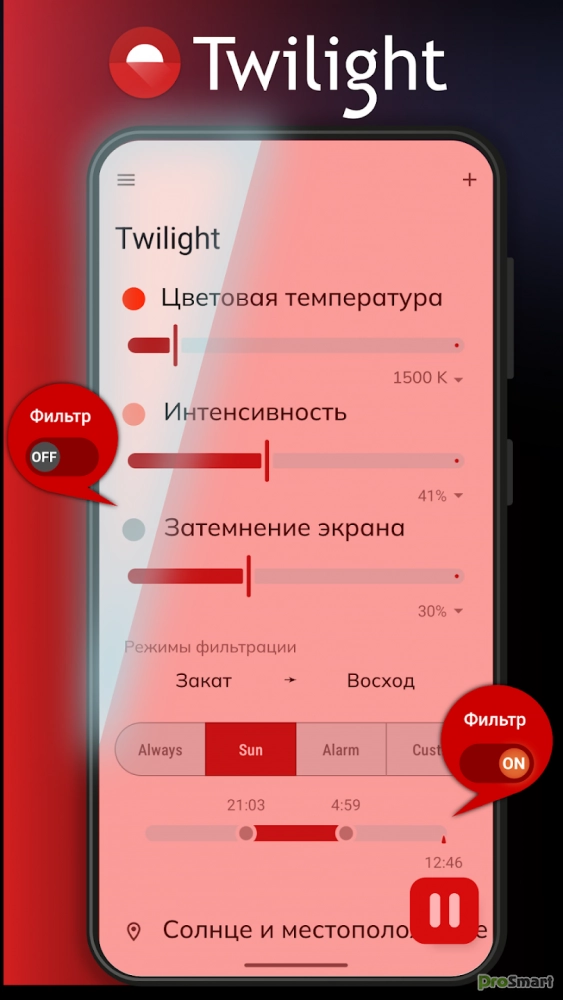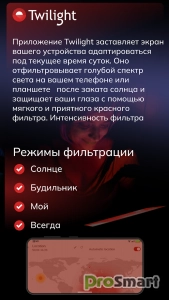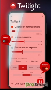 Приложение Twilight позволяет экрану вашего устройства адаптироваться под текущее время суток. Оно отфильтровывает голубой спектр света на вашем смартфоне или планшете после заката и защищает ваши глаза с помощью мягкого и приятного красного фильтра. Интенсивность фильтра плавно регулируется относительно солнечного цикла, основанного на вашем местном времени заката и восхода солнца.